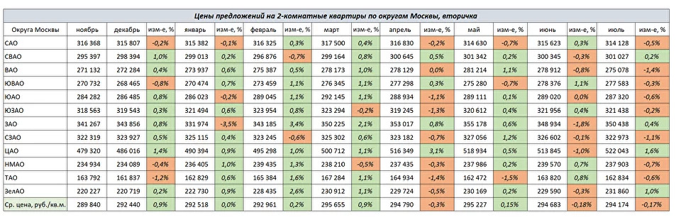 Динамика цен на 2-комнатные квартиры в июле: