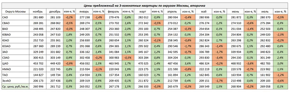 Средние цены предложений на 3-комнатные квартиры показаны в таблице ниже: