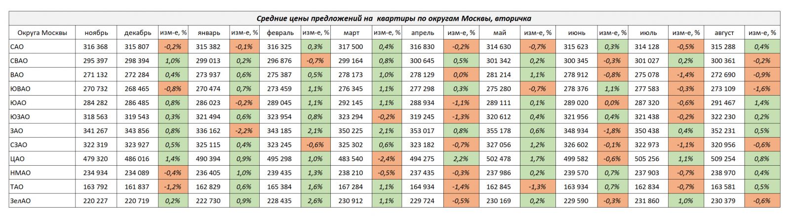 Средние цены предложений по вторичной недвижимости по округам столицы на конец августа 2024 г.