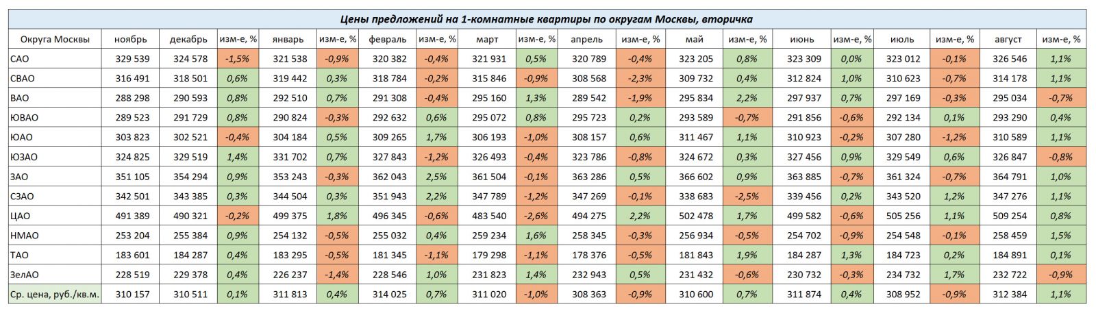 В августе изменение цен в сегЗелАО 1-комнатных квартир было разнонаправленным. Лидером роста был НМАО, +1,5%. Снизились цены более всего в ЗелАО (-0,9%).