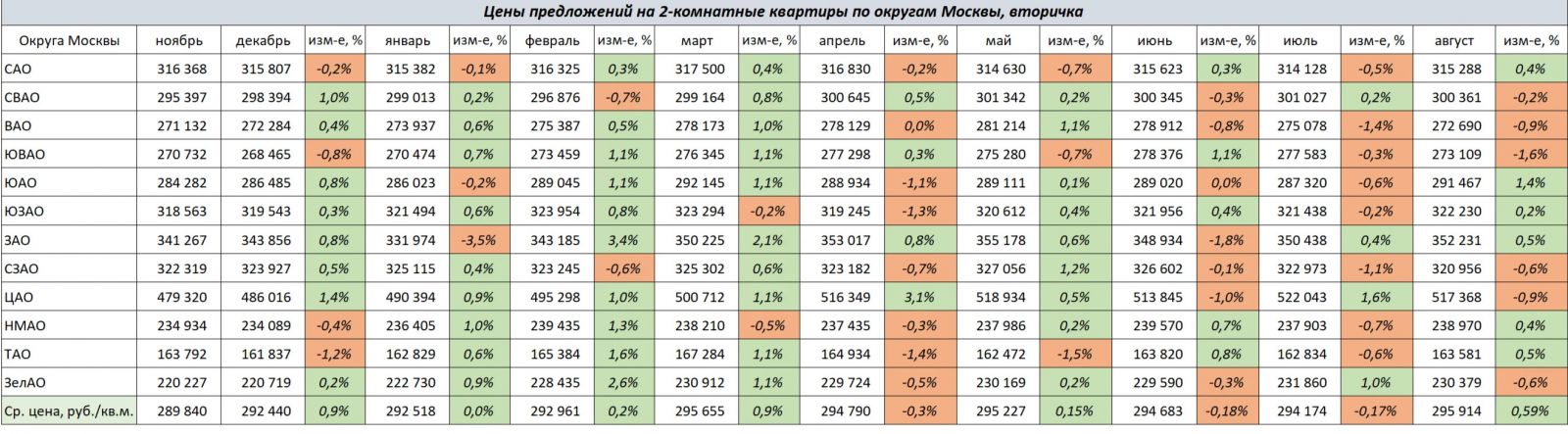 В августе 2024 года средние цены на вторичную недвижимость в столичном регионе показали небольшой рост на 0,59% до уровня 295 914 руб. за 1 кв.м;
