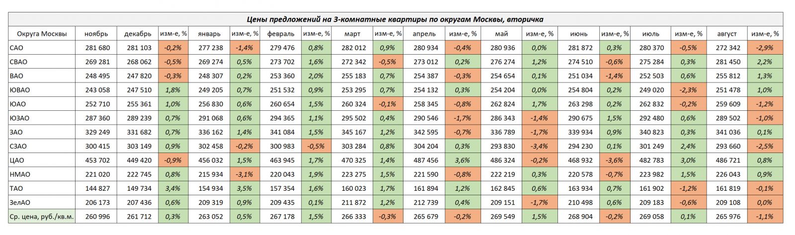 Средние цены предложений на 3-комнатные квартиры показаны в таблице ниже.